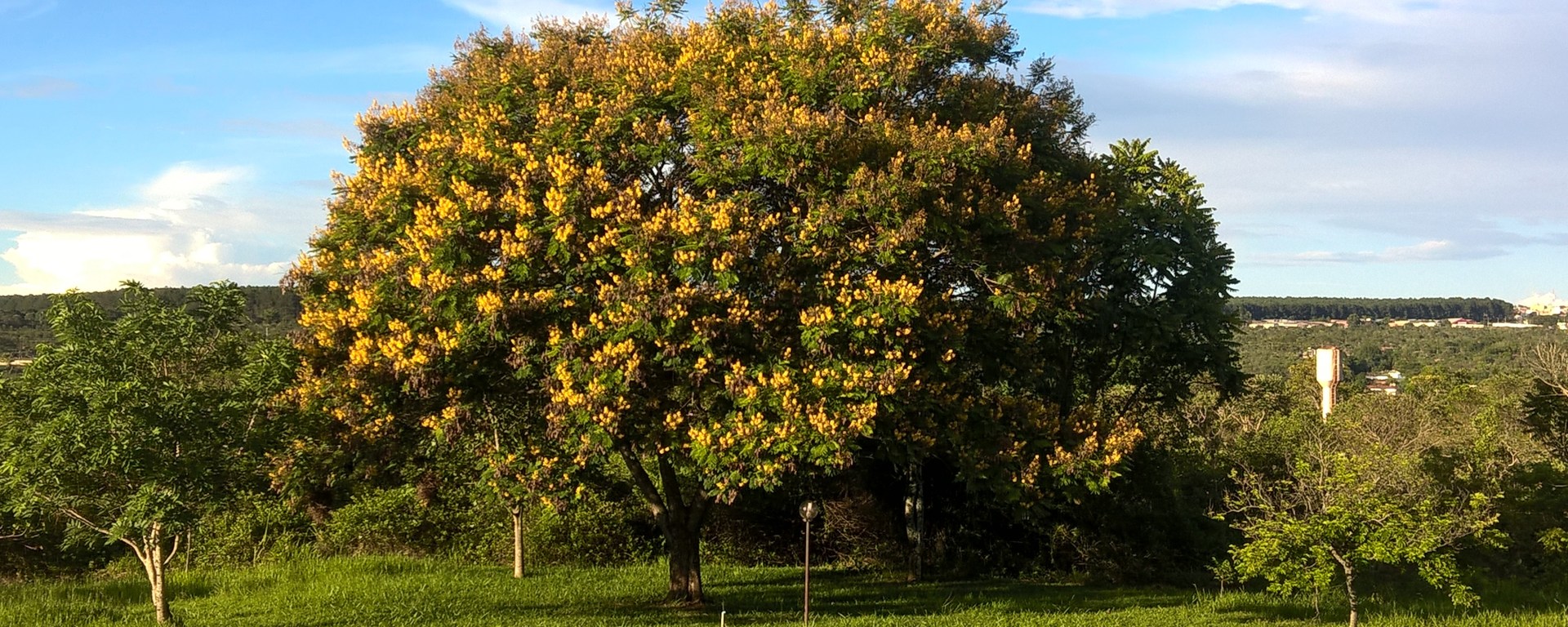 Peltophorum dubium. Esta está por toda parte em dezembro e janeiro, com destaque especial para a L2 Norte e Sul, porções finais e também W3 Sul. Sinonímia variada: também conhecida como farinha seca, faveira, ibirapuitã, sobrasil, tamborim bravo, guarucaia. Assim nos ensina o mestre Harri Lorenzi. Ele é da floresta, não do cerrado, mas se deu muito bem por aqui.O nome canafístula é dado a pelo menos três ou quatro espécies diferentes. A confusão semântica é compensada pela sua beleza, pintando exageradamente de amarelo as copas e mesmo o chão junto delas. É a flor daqueles que considero os melhores meses em Basília, correspondendo ao início e consolidação da estação chuvosa, que é tão ansiosamente esperada por aqui. Viva ela! (A foto eu capturei de frente ao Mosteiro de São Bento, no Lago Sul)