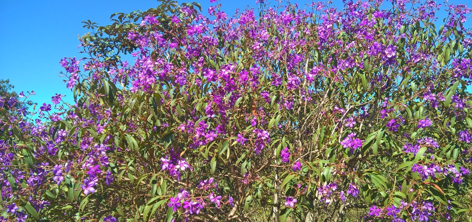 Quaresmeira ou Tibouchina candolleana, para os íntimos. Da família Melastomataceae. Quem não conhece? A da mata é outra. Estamos falando daquela que enfeita o cerrado, logo que terminam as chuvas em março, coincidindo com o período da quaresma, mas ultrapassando esta em termos de duração da florada. Daí seu nome. Ela é nativa do cerrado, de porte apenas médio (4 a 7 metros), como de hábito nestas paragens. Ocorre amplamente na Bahia, no DF, em Goiás, em Minas Gerais, em ecossistemas não só de cerrado, mas também de mata seca, mata ciliar e mesmo em áreas periodicamente inundáveis. Sua copa é arredondada, o tronco ramificado, folhas com textura áspera, com características nervuras paralelas, em número de três. O fruto nada mais é do que uma pequena cápsula, com minúsculas e numerosas sementes. É considerada uma espécie pioneira, sem deixar de ser também ornamental. Estamos falando da quaresmeira do cerrado,que deve ser diferenciada da quaresmeira da mata atlântica, de cor roxa ou rosa, Tibouchina granulosa, esta, pelo seu porte, muito utilizada na arborização urbana. A quaresmeira, pelo menos nesta última variedade, tem período de vida estimado entre 60 e 70 anos. Dizem os alfarrábios: <A quaresmeira é uma árvore pioneira, rústica e simples de cultivar, vegetando mesmo em solos pobres. Originária da mata atlântica, esta espécie aprecia o clima tropical e subtropical, tolerando bem o frio moderado. Multiplica-se por sementes, com baixa taxa de germinação, e por estaquia de ramos semi-lenhosos. Sua madeira apesar de ser de qualidade inferior é indicada para a construção de vigas, caibros, obra internas, postes, esteios e moirões para lugares secos>. Mais quem haveria de cortar uma belezura dessas para fazer caibros ou esteios?