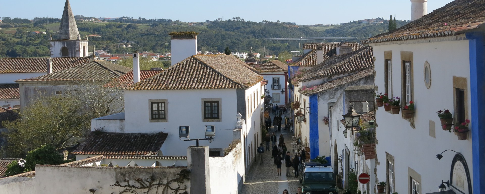 É forçoso não economizar no uso de adjetivos para falar de Óbidos. Ela é esplêndida! Rodeando a muralha por fora, estamos em uma pequena rua de casas modestas, mas muito agradáveis à vista. Residências a partir das quais o que se vê, do outro lado da rua, é tão somente a grande muralha de pedra, nada mais. Passado o pórtico, um recesso com um grande painel de azulejos se apresenta, bem português. E vamos adiante percorrer as vielas de Óbidos, a Anciã, com suas duas ou três ruas longitudinais e diversos becos transversais. E casas bem sólidas, sem deixarem a modéstia de lado, quase sempre com pintura imaculadamente branca e barrados, cantoneiras, portas e janelas em azul ou amarelo. Poucas igrejas, talvez duas, não mais. Para as rezas em favor d’El Rey e contra os mouros e castelhanos já seria o bastante.